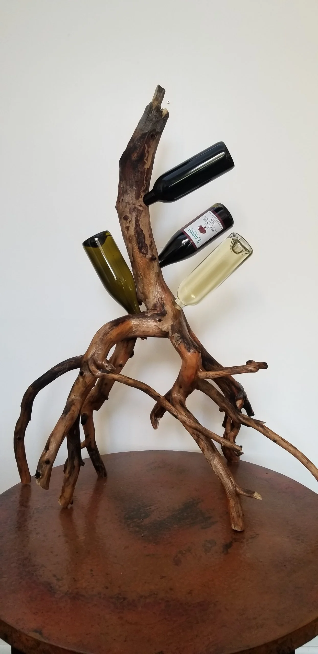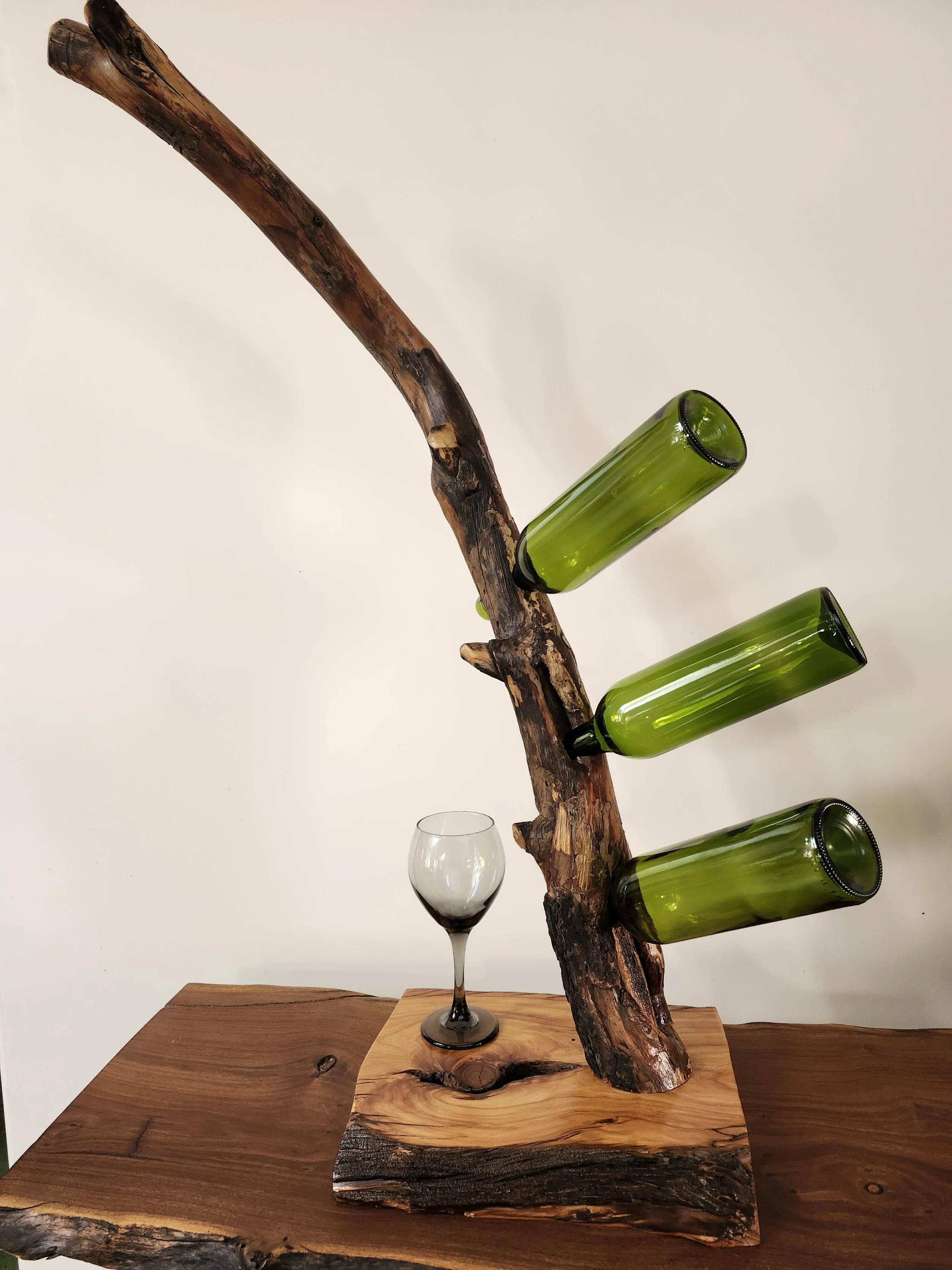These unique wine holder designs feature split logs and drift wood from natural woods that have been downed and discarded. In some pieces, the bark is partially left intact, showing the depths of the wood’s beauty. Some pieces are stripped down to their inner hard wood. Each piece is uniquely and thoughtfully stained and finished to enhance its natural beauty.